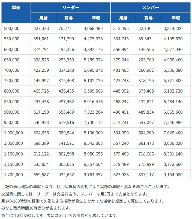 契約単価に対して、年収がいくらになるか分かる早見表も記載しています。